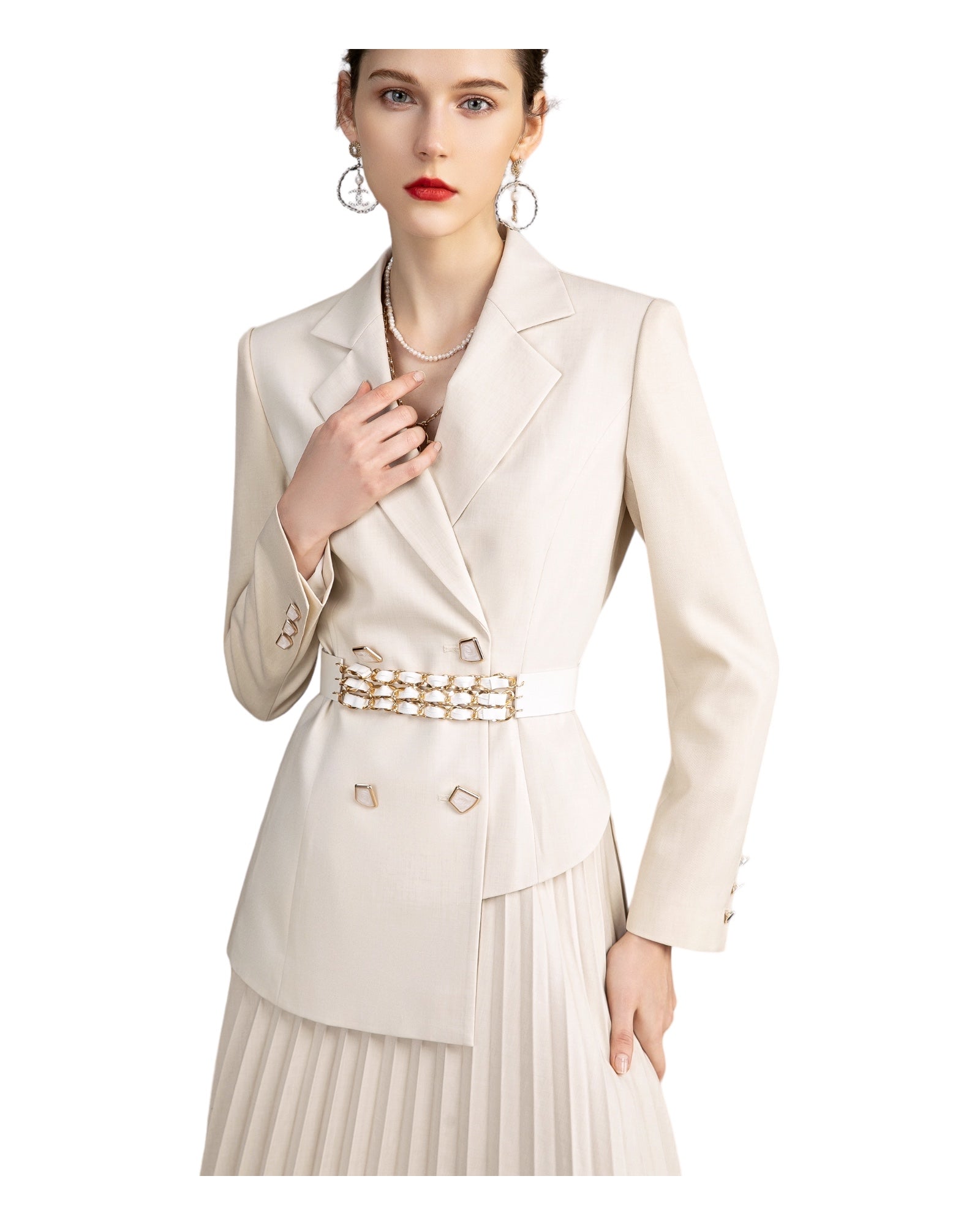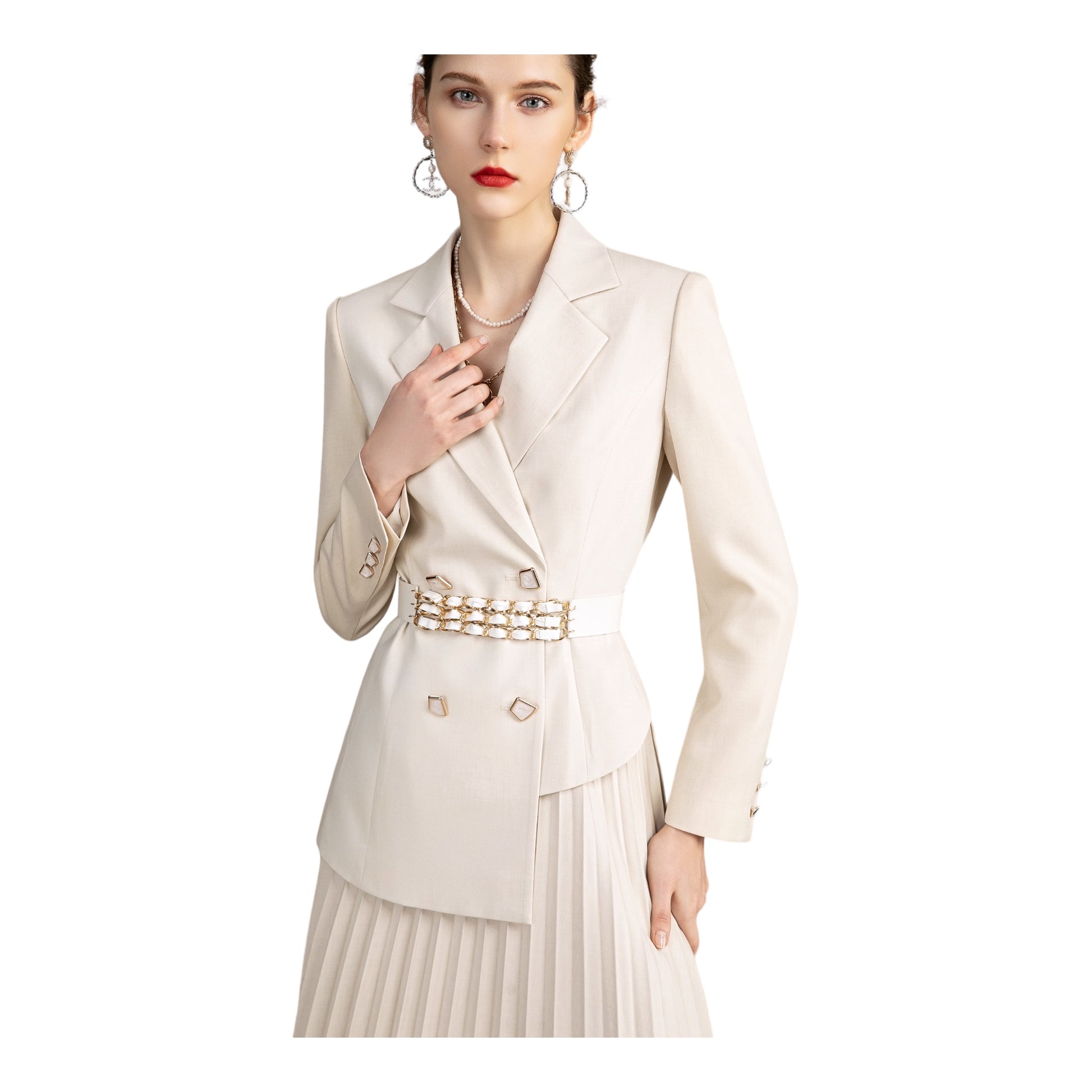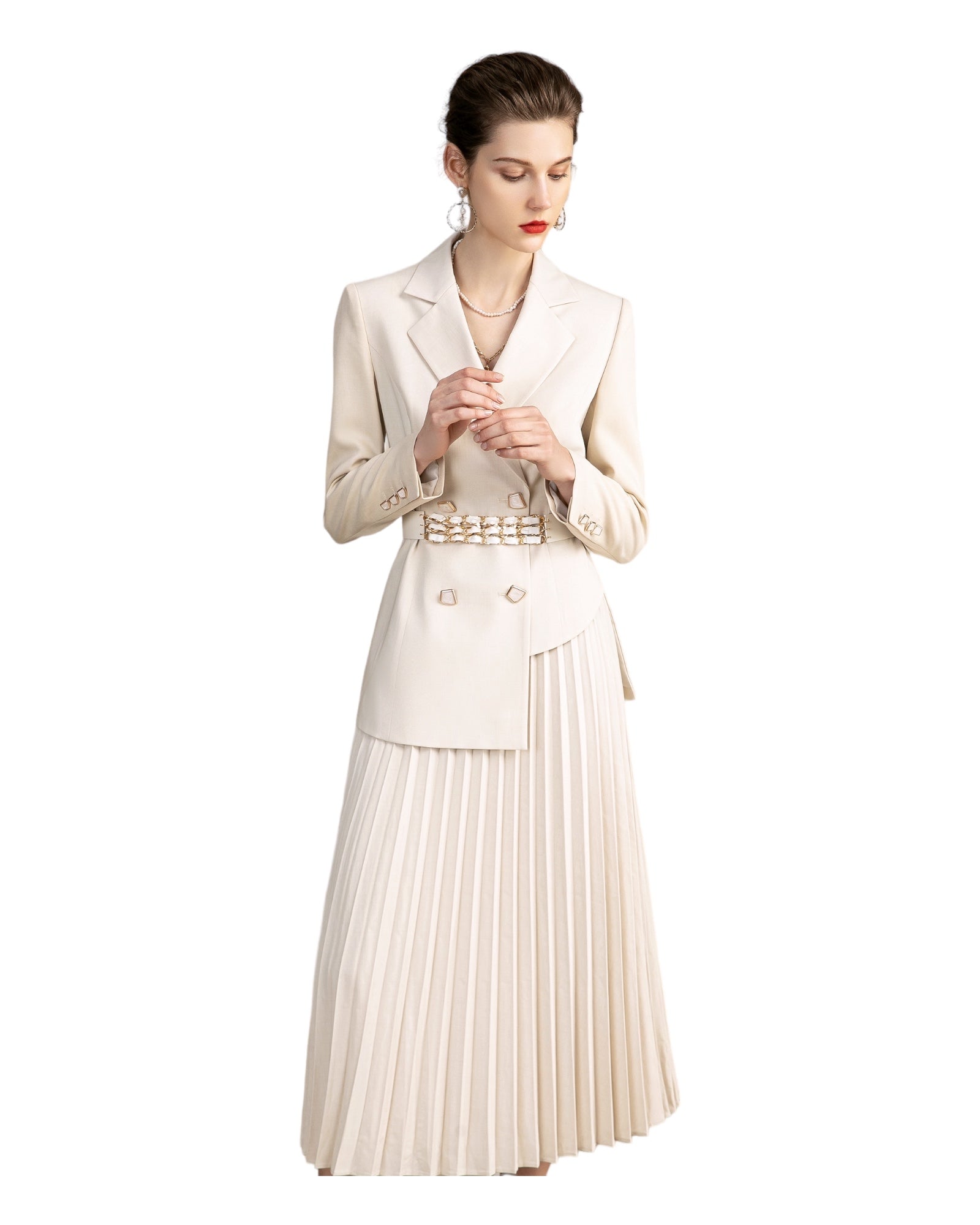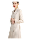 This outfit is perfect for making a timeless, striking impression. Crafted from luxe cream fabric, the tailored blazer and pleated skirt create a sophisticated, elegant ensemble. Whether you're attending formal events or going out in style, this classic look is sure to get you noticed.